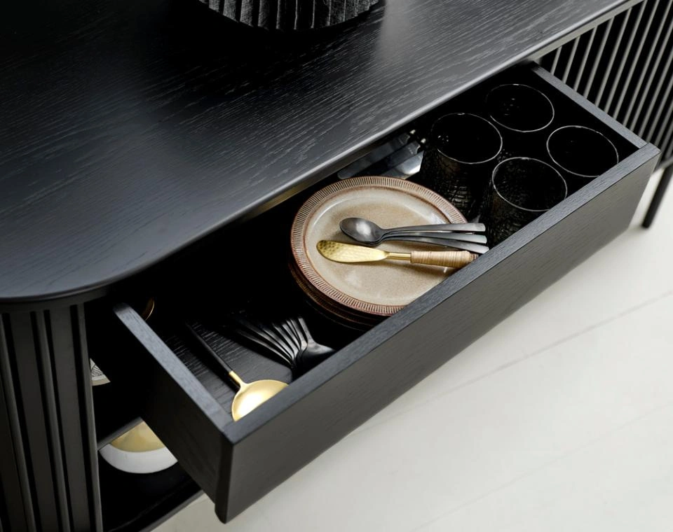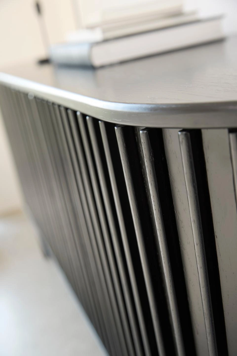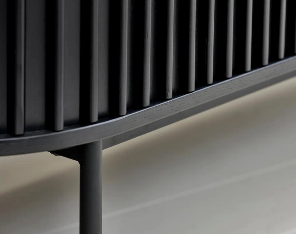 Komoda Siena černá drážkovaná 160 cm byla navržena jako výrazný, ale stále subtilní akcent v moderním interiéru. Zaoblený, oválný tvar narušuje ostré linie nábytku a stěn, díky čemuž komoda dodává prostoru lehkost. Drážkované čelo v odstínu černý dub přitahuje pozornost hrou světla a stínu a vytváří dojem hloubky a luxusu. Není to jen komoda do obývacího pokoje – je to centrální prvek denní zóny, na kterém můžete vystavit lampu, dekorace nebo rodinné památky.