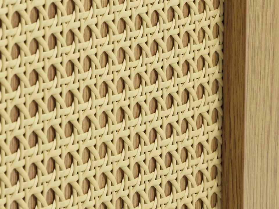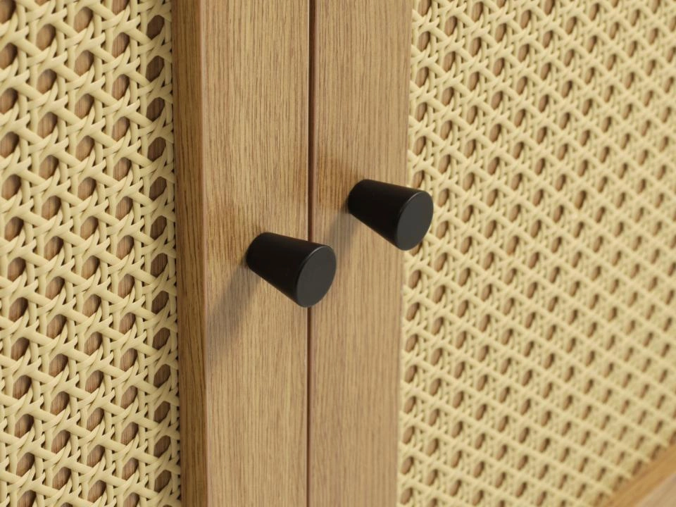 Čela komody jsou vyplněna dekorativním ratanem, díky čemuž nábytek okamžitě upoutá pozornost a dodá aranžmá útulnější charakter. Korpus a horní deska v odstínu přírodního dubu podtrhují boho estetiku a skvěle ladí se světlými stěnami, pokojovými rostlinami a textiliemi. Polomatná povrchová úprava eliminuje nežádoucí odlesky světla, takže komoda do obýváku Pensacola působí elegantně jak ve dne, tak večer při tlumeném, náladovém osvětlení.