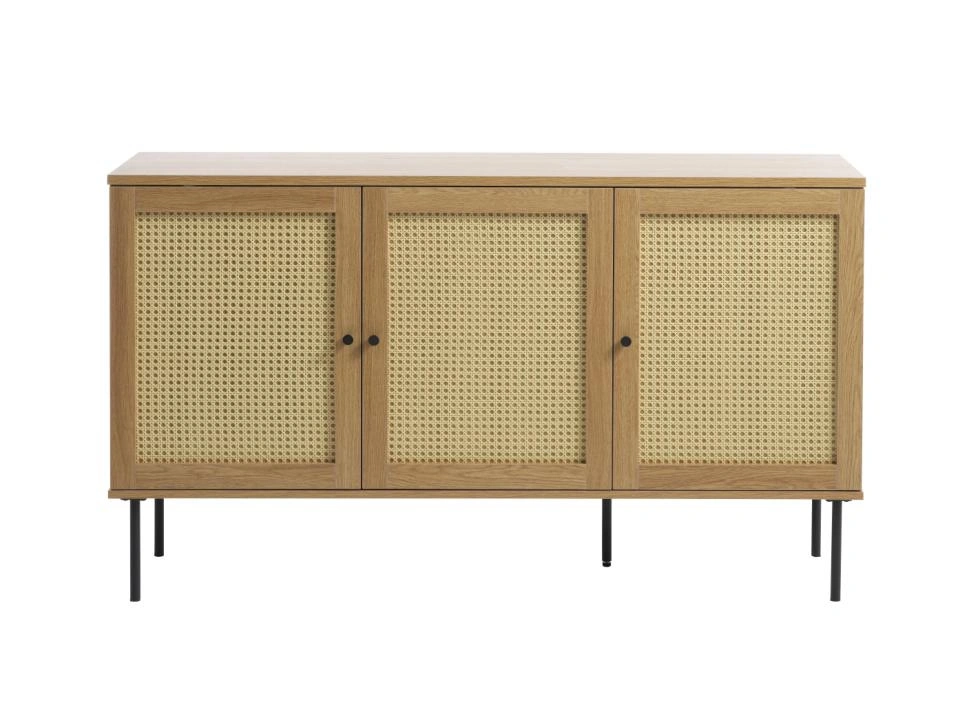 Komoda Pensacola značky UNIQUE je 140cm moderní dřevěná komoda s ratanovými čely, ideální do obývacího pokoje, jídelny nebo předsíně. Stojí na černé ocelové podstavě, má tři uzavíratelné skříňky a dvě police, takže nabízí praktický úložný prostor a zároveň vnáší do interiéru teplo přírodního dubu a lehkost boho stylu.