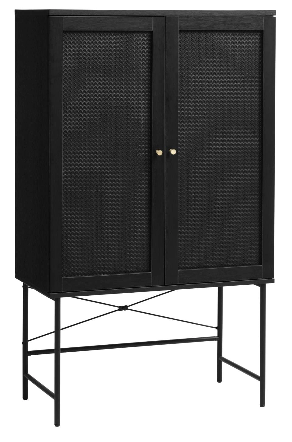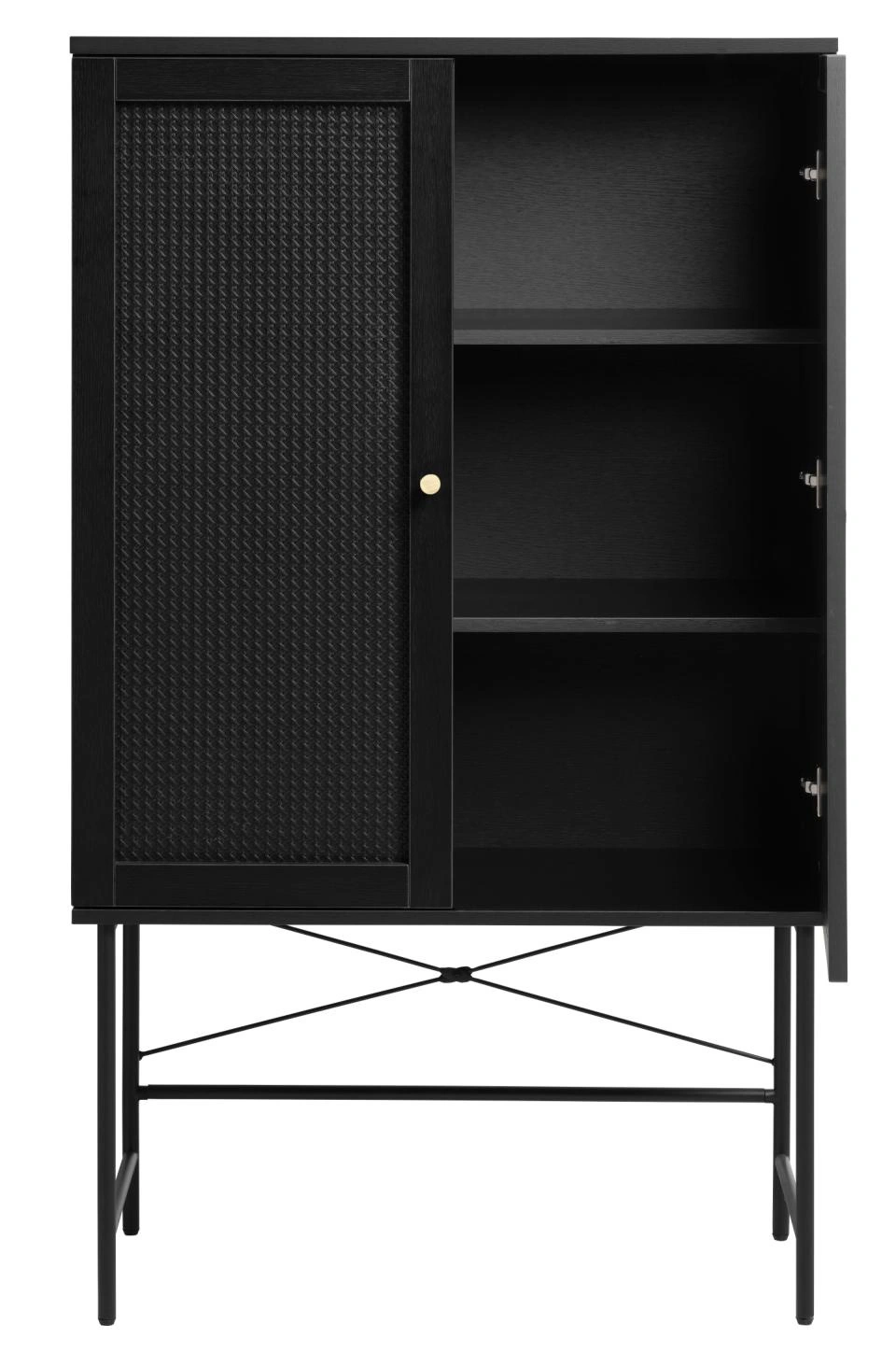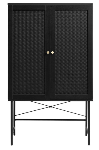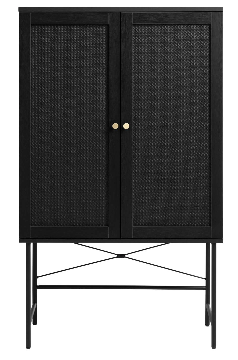 Vysoká komoda Pensacola značky UNIQUE Furniture je elegantní černá komoda na nožkách s ratanovými čely, ideální do obývacího pokoje, ložnice nebo předsíně. Výška 135 cm a šířka 80 cm nabízí dostatek úložného prostoru a dvě uzavíratelné skříňky s policemi pomáhají udržet pořádek – stylově a v moderním duchu.