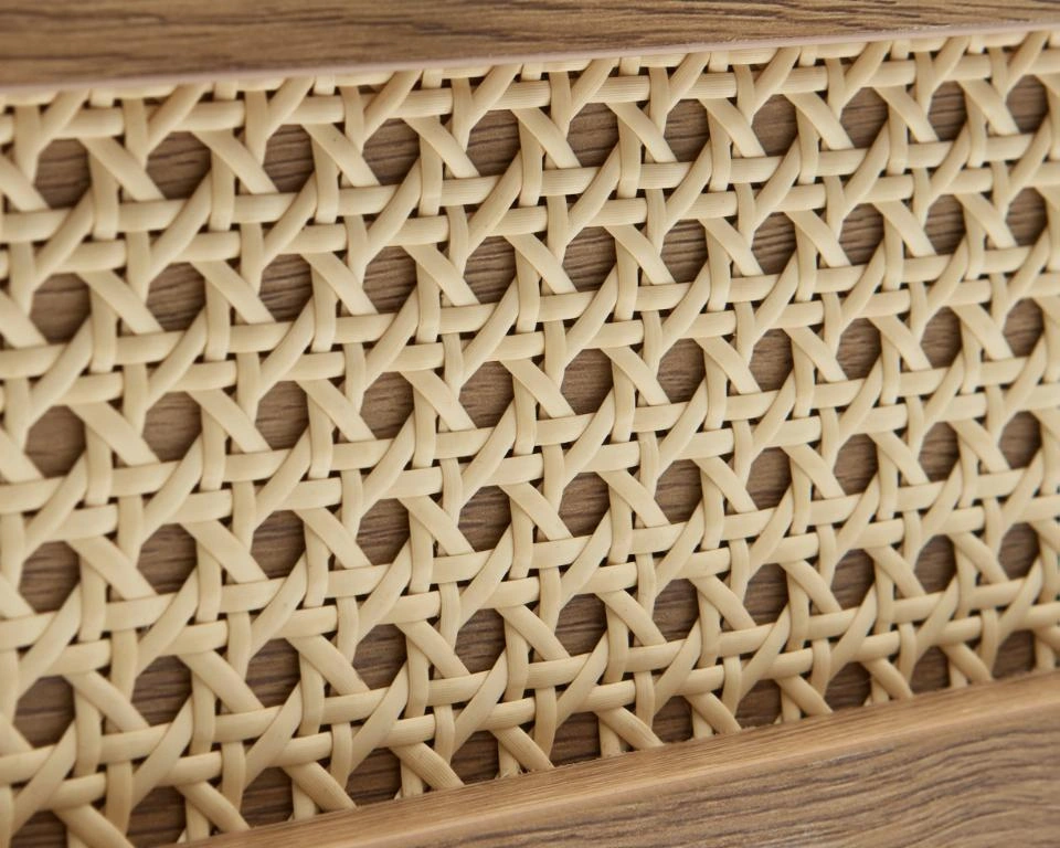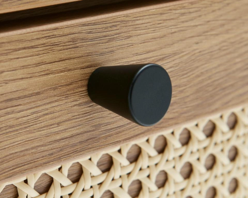 Přírodní barva dubu a vzdušná ratanová struktura čel dodávají komodě Pensacola výrazný, orientálně–boho charakter. Nábytek se skvěle hodí jako komoda do obývacího pokoje, vnáší do prostoru lehkost a útulnost – místo těžkého, masivního kusu získáte jemný dekorativní akcent. Polomatná povrchová úprava zvýrazňuje kresbu dubové dýhy a černé nohy a úchytky dodávají nádech moderní elegance.