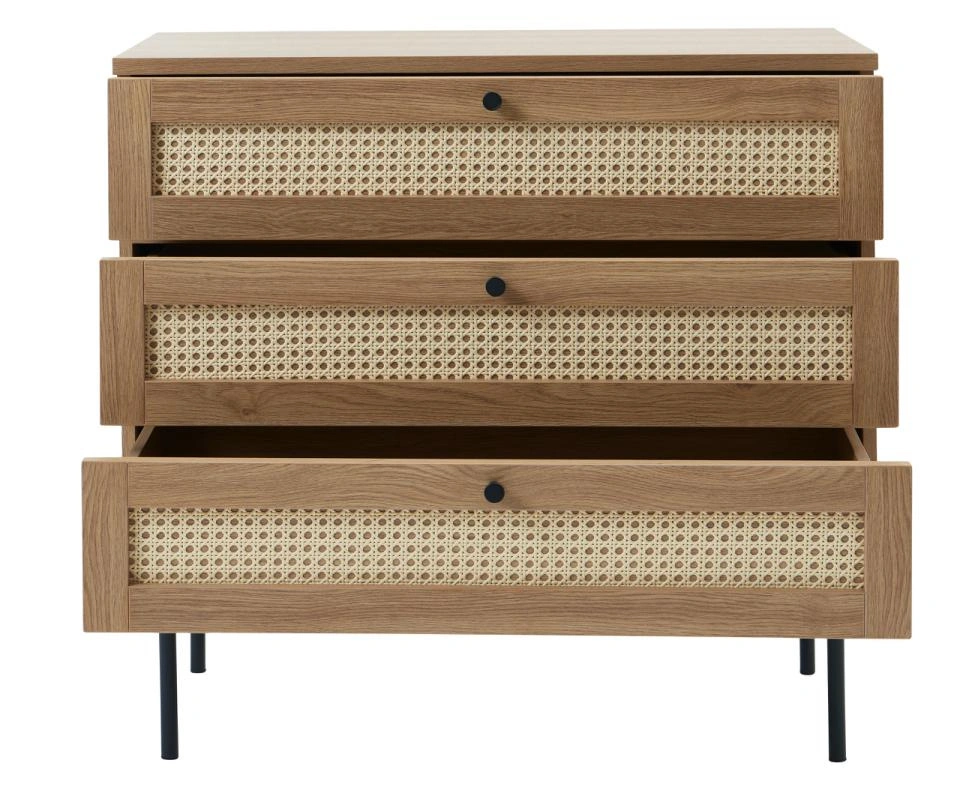 Komoda Pensacola značky UNIQUE je moderní komoda se zásuvkami o šířce 80 cm, která kombinuje dubovou dýhu v přírodním odstínu s dekorativními ratanovými čely. Tři prostorné zásuvky na elegantní černé kovové podnoži vytvářejí funkční kus nábytku do obývacího pokoje, jídelny, předsíně nebo studentského pokoje.