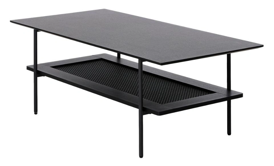 Výška 40 cm zajišťuje, že obdélníkový konferenční stolek perfektně ladí s většinou sedaček a rohových gaučů a umožňuje pohodlně odkládat šálek kávy, notebook nebo talířek s občerstvením. Šířka 110 cm a hloubka 55 cm poskytují dostatek místa, přesto však stolek zůstává praktickým menším konferenčním stolkem, který v prostoru nepůsobí těžce. Dvouúrovňová konstrukce s přídavnou policí pomáhá lépe zorganizovat obývací pokoj – horní deska slouží pro každodenní používání, spodní police na uložení věcí a vystavení dekorací. Díky stabilní kovové podnoži se čtyřmi nohami může odkládací stolek plnit také funkci pomocného stolku v pracovně nebo kanceláři.Materiály a detaily, které dělají rozdíl