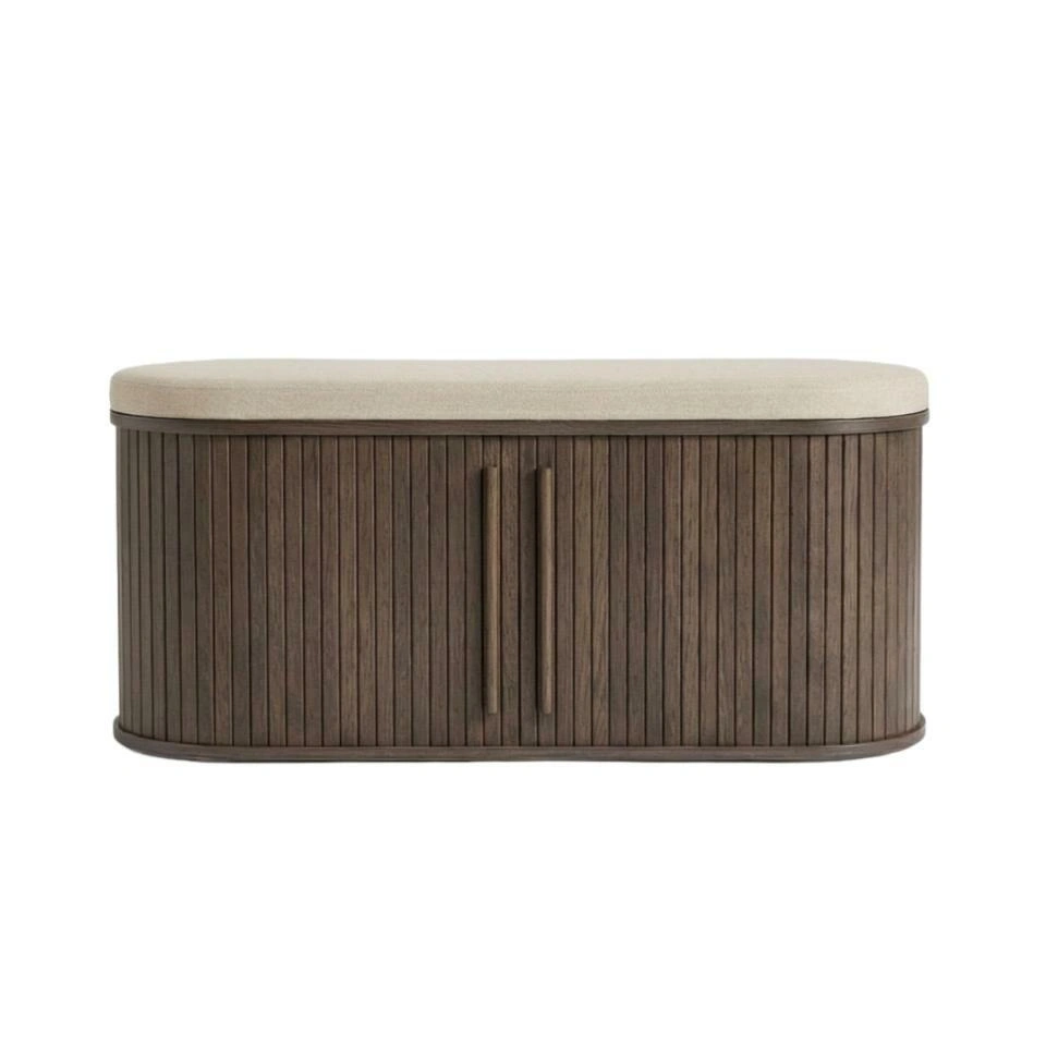 Kombinace béžového sedáku s tmavým, polomatným podstavcem vytváří výrazný, ale elegantní kontrast, který skvěle zapadne do moderního, minimalistického stylu. Čelo s dekorativními svislými lamelami dodává korpusu lehkost a osobitý charakter – lavice se tak stává nejen praktickým kusem nábytku, ale také zajímavým dekorativním prvkem v zóně vstupu.