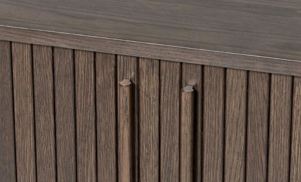 Charakter této komody určuje povrch z dubové dýhy v odstínu dub espresso a efektní svisle rýhované čelní plochy. Taková rýhovaná komoda v barvě tmavého dubu se krásně hodí k moderním i boho interiérům, kterým dodá hloubku a útulnou atmosféru. Oválné zakončení horní desky zjemňuje tvar nábytku, takže komoda vizuálně nezatěžuje prostor, ani v menším obýváku nebo studentském pokoji.