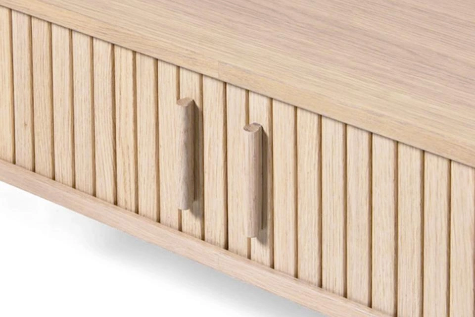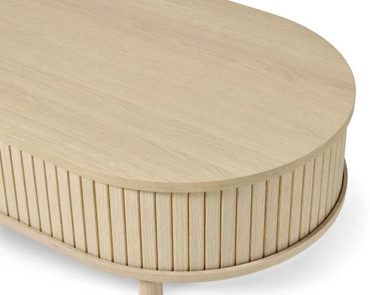 Oválný konferenční stolek Meta je skvělou volbou pro ty, kteří si potrpí na minimalismus a hřejivost přírodního dřeva. Deska z dubové dýhy v odstínu bělený dub jemně projasní interiér a snadno ji sladíte se světlou sedačkou, šedou rohovou pohovkou nebo nábytkem v boho či rustikálním stylu. Zaoblený tvar stolku přispívá k bezpečnému používání – absence ostrých hran oceníte zejména v domácnosti s dětmi nebo v menším obýváku. Čtyři stabilní nohy z dubového dřeva dodávají konstrukci vizuální lehkost a zároveň zajišťují pevnou oporu. Takový moderní konferenční stolek vypadá skvěle jako centrální bod odpočinkové zóny, ale uplatní se i jako loftový konferenční stolek v eklektičtěji zařízených interiérech.Funkční stolek do obýváku s úložným prostorem