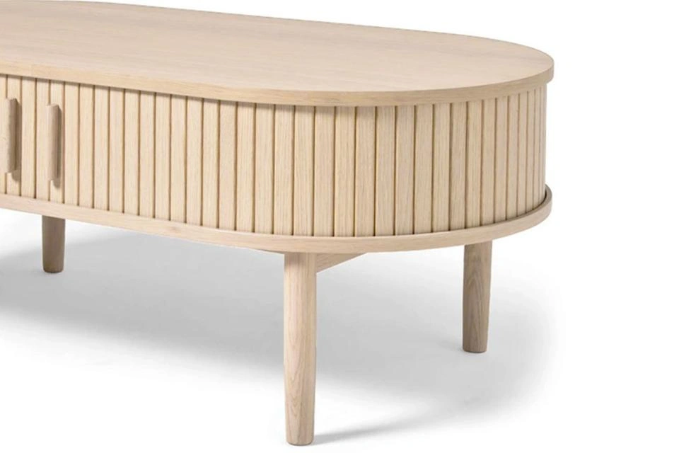 Konferenční stolek Meta 120x60 značky UNIQUE Furniture je elegantní, oválný dřevěný stolek v odstínu běleného dubu, ideální do skandinávského a moderního obývacího pokoje. Při rozměrech 120×60×45 cm nabízí pohodlnou odkládací plochu a praktický úložný prostor, takže získáte místo na kávu i nenápadné uložení drobností.Skandinávský design – lehká forma, přírodní dřevo