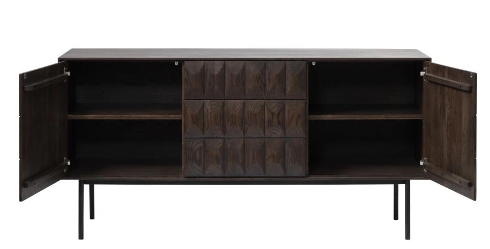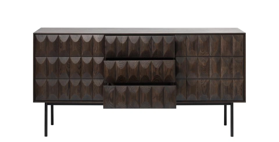 Komoda Latina značky UNIQUE je elegantní, moderní komoda se zásuvkami z dýhovaného dubu v odstínu espresso, postavená na štíhlých černých ocelových nohách. Šířka 160 cm a promyšlené rozdělení na 2 skříňky s policemi a 3 zásuvky z ní dělají ideální komodu do obývacího pokoje nebo jídelny – spojuje funkci výrazné dekorace s praktickým úložným prostorem.