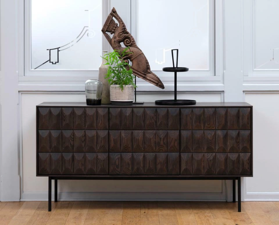 Latina je moderní komoda, která upoutá pozornost hlubokým, tmavým mořením dubu v tónu kávově hnědé. Dubová dýha na čelech a horní desce krásně zvýrazňuje kresbu dřeva, díky čemuž působí nábytek ušlechtile a nadčasově. Černé kovové nohy dodávají celé komodě lehkost a podtrhují její charakter – báječně zapadne jak do současného obývacího pokoje, tak do elegantní jídelny nebo reprezentativní vstupní haly.
