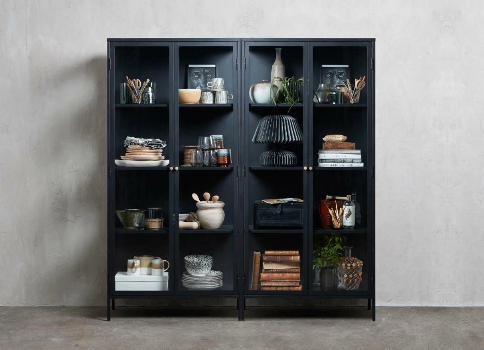 Kovová, jednoduchá silueta s jemnými, minimalistickými úchyty se dobře kombinuje s dalším kovovým i dřevěným nábytkem. Je to investice do nábytku, který jen tak nevyjde z módy – loftová černá prosklená vitrína zůstane aktuální bez ohledu na měnící se trendy a doplňky ve vašem domově.