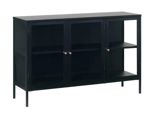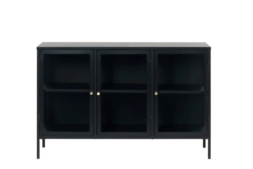 Komoda Carmel značky UNIQUE je černá, moderní komoda na nožičkách se zasklenými dvířky, která v sobě spojuje funkci komody a vitríny. Kovová konstrukce o šířce 132 cm a hloubce 40 cm zajišťuje stabilní úložný prostor, zatímco skleněná čela efektně vystavují obsah a dodávají interiéru lehkost a eleganci.