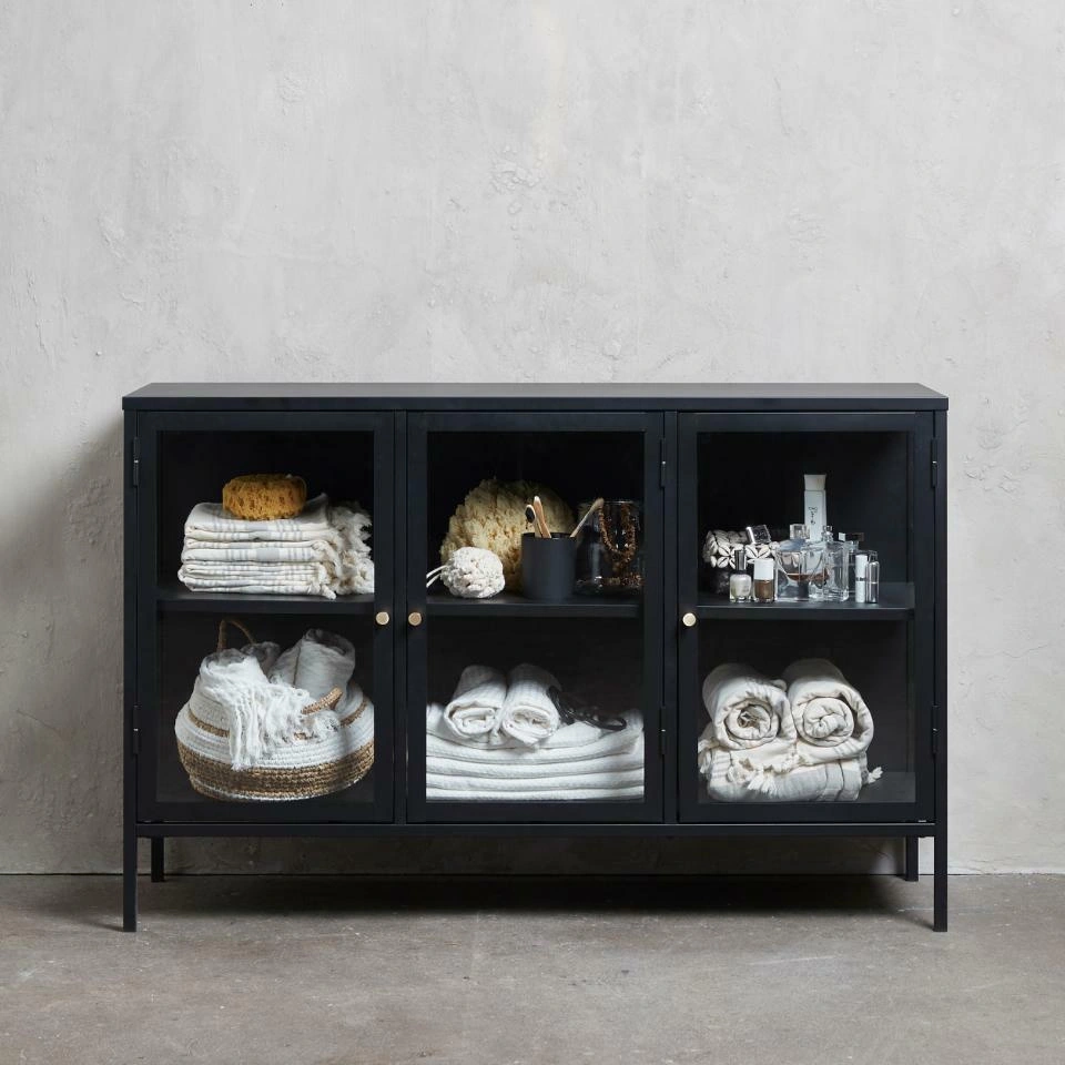 Tato černá komoda je vyrobena z kovu a skla, což jí dodává charakter moderní loftové komody. Matná povrchová úprava oceli omezuje viditelnost otisků prstů a zároveň výborně ladí jak se surovou cihlou, tak s hladkými, světlými stěnami. Prosklená čela opticky odlehčují celou skříňku, takže nábytek nepůsobí těžce ani v menších místnostech.