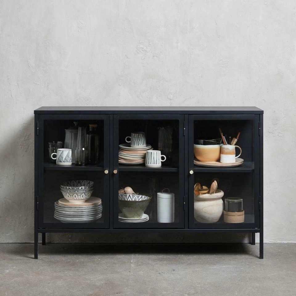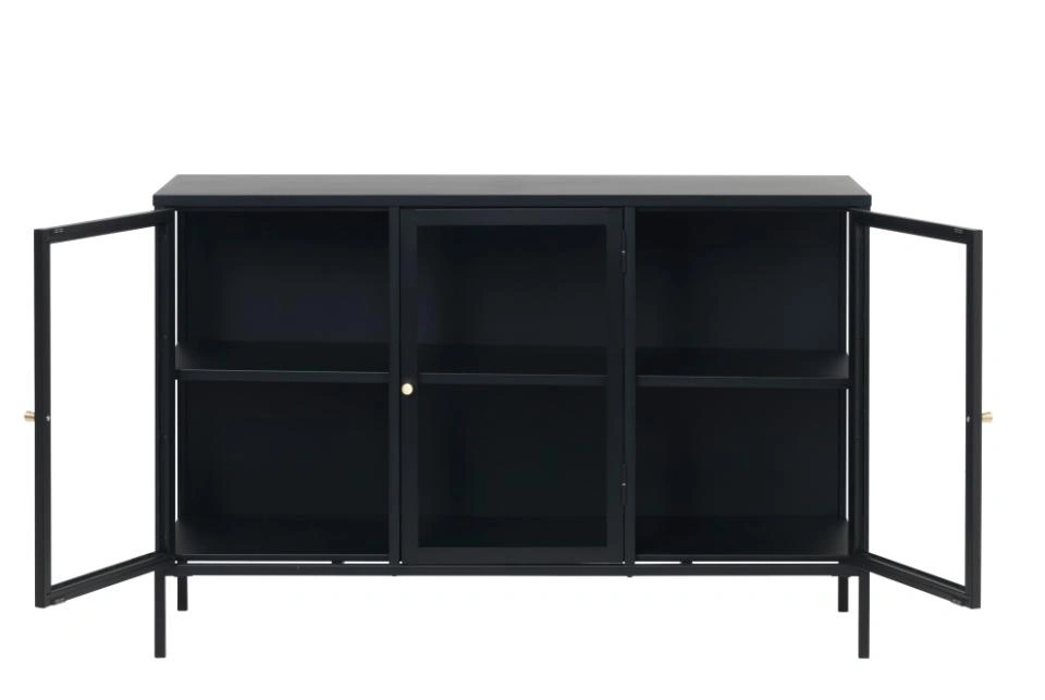Komoda Carmel se perfektně uplatní jako komoda do jídelny na sklo a stolní servis, ale také jako minimalistická vitrína v obývacím pokoji. Její proporce (132 cm šířky při hloubce 40 cm) umožňují umístění jak k delší stěně, tak i do užšího průchodu. Černá kovová komoda je výrazný prvek, který snadno zkombinujete s dřevěným stolem, koženou sedací soupravou nebo betonovými doplňky a vytvoříte tak jednotné, moderní zařízení interiéru.