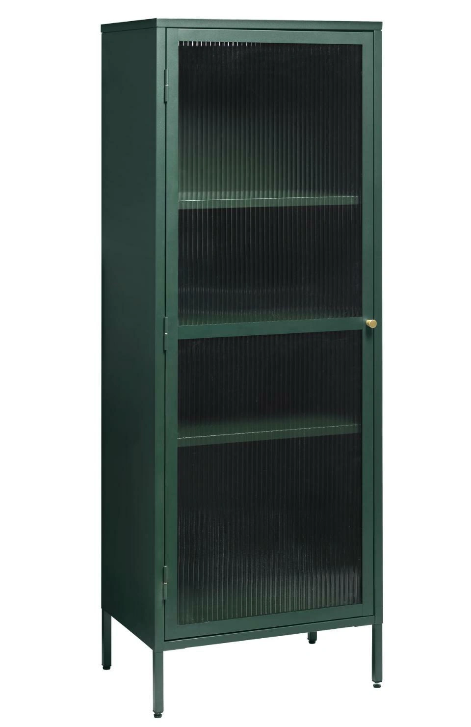 Kovová vitrína Bronco 160 cm od značky UNIQUE je vysoká, štíhlá vitrína do obývacího pokoje, vyrobená kompletně z oceli s prosklenými, rýhovanými dvířky. Minimalistická zelená konstrukce na čtyřech nohách se skvěle hodí jako moderní vitrína na alkohol i vitrína na knihy a spojuje dekorativní efekt s praktickým úložným prostorem.
