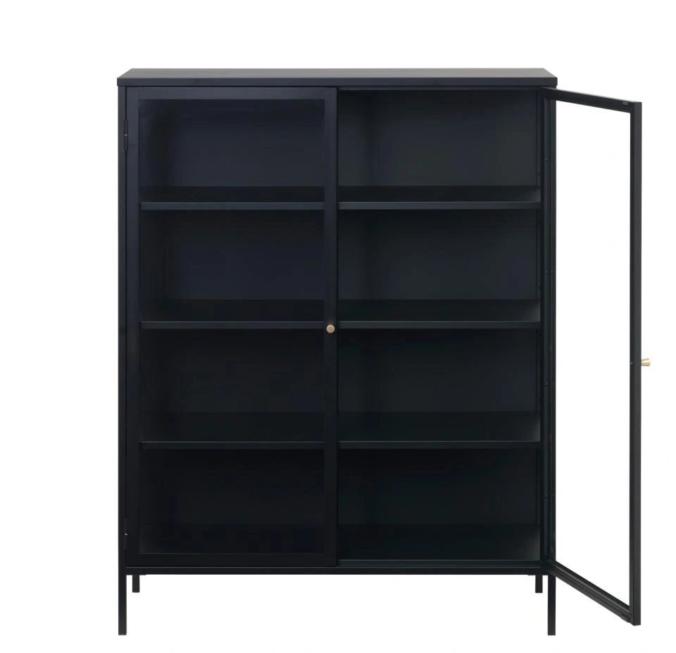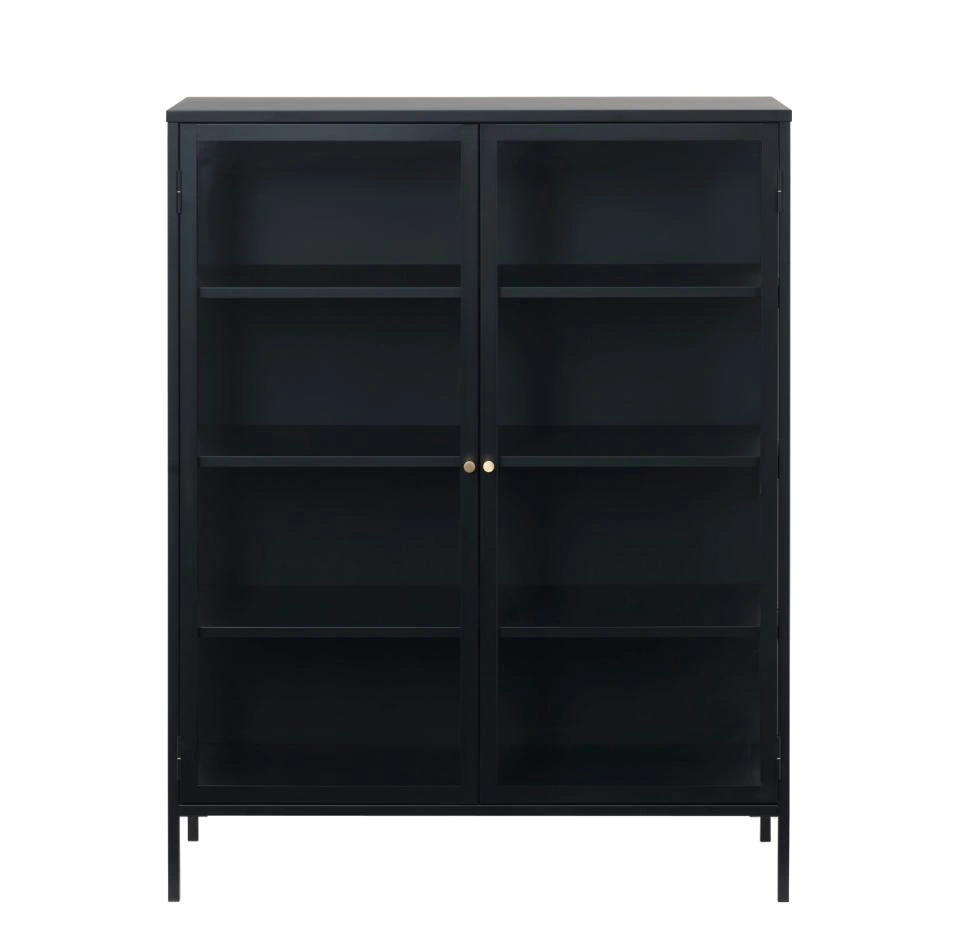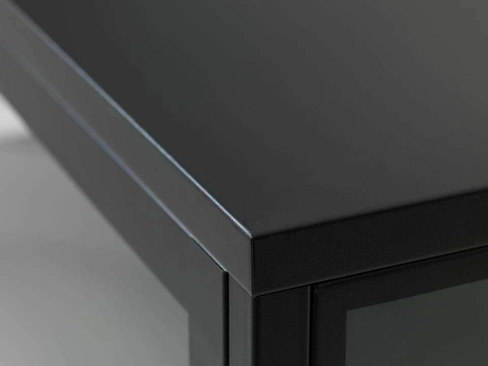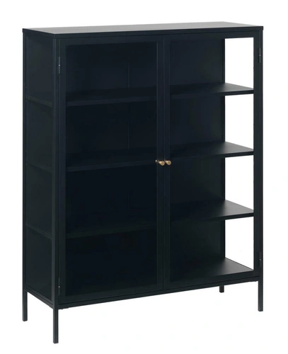 Celokovová, černá konstrukce stojí na čtyřech nohách, což nábytku dodává vzdušný, odlehčený vzhled a zároveň usnadňuje úklid podlahy pod vitrínou. Matná povrchová úprava ladí se surovými loftovými doplňky – betonem, cihlou, tmavým dřevem – a umožňuje snadno kombinovat vitrínu s dalšími kovovými kusy nábytku do jednotného celku. Každá z polic unese zatížení až 10 kg, takže máte široké možnosti aranžování knih, porcelánu i těžších dekorací.