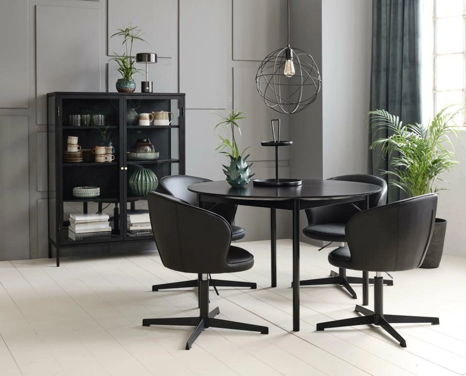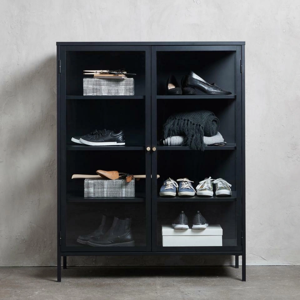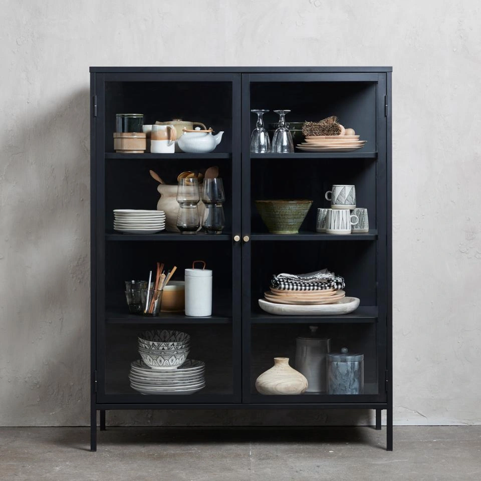 Černá vitrína Carmel byla navržena pro moderní a loftové interiéry, kde se počítá jak design, tak praktičnost. Díky dvěma proskleným dveřím a třem širokým policím snadno zorganizujete knihy, sklenice na drinky, dekorace nebo sbírky, které chcete mít na očích. Matná černá a hladké čelo dodávají nábytku nadčasový charakter – vitrína perfektně zapadne jak do industriálního obývacího pokoje, tak do minimalistické předsíně.