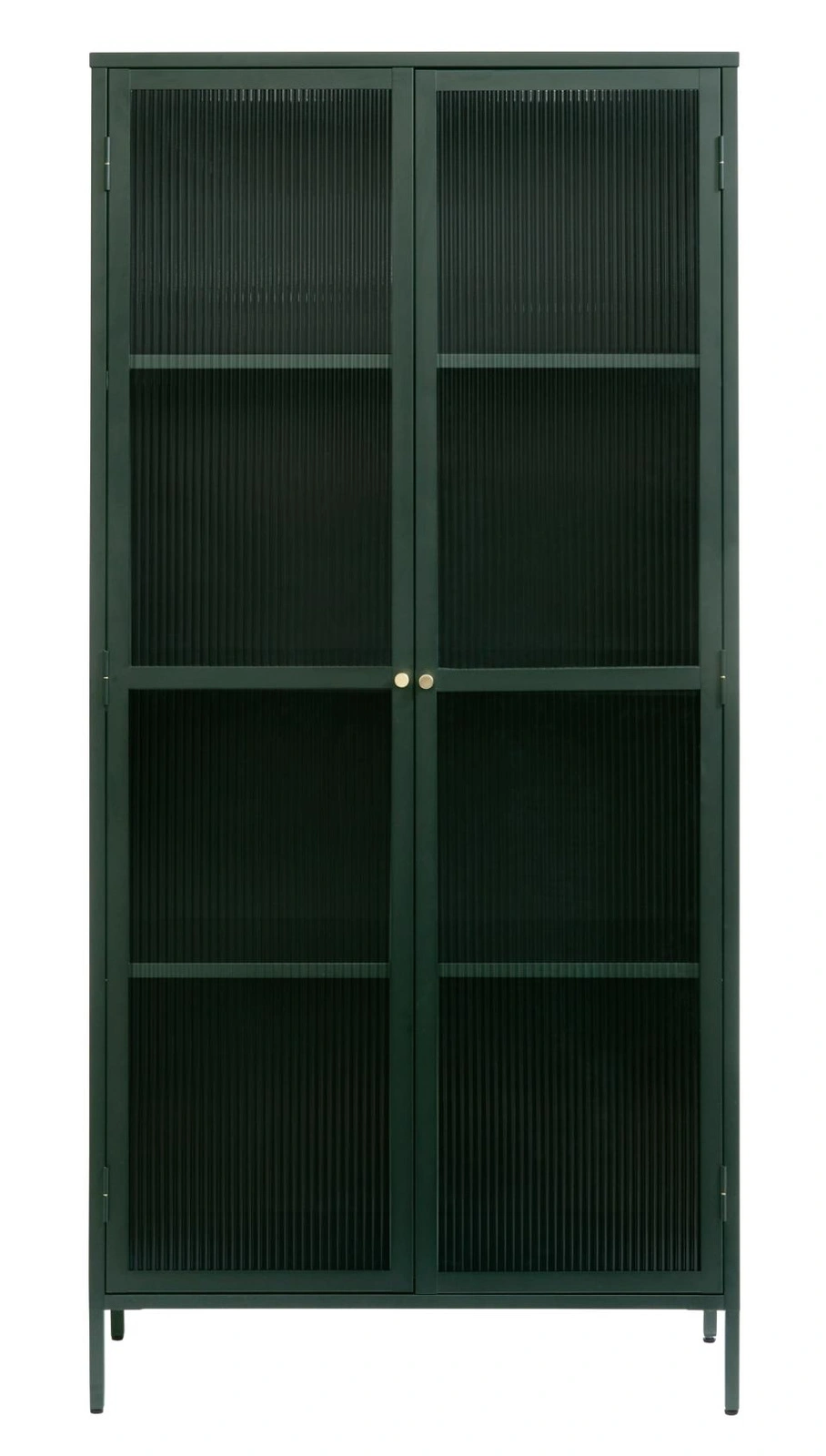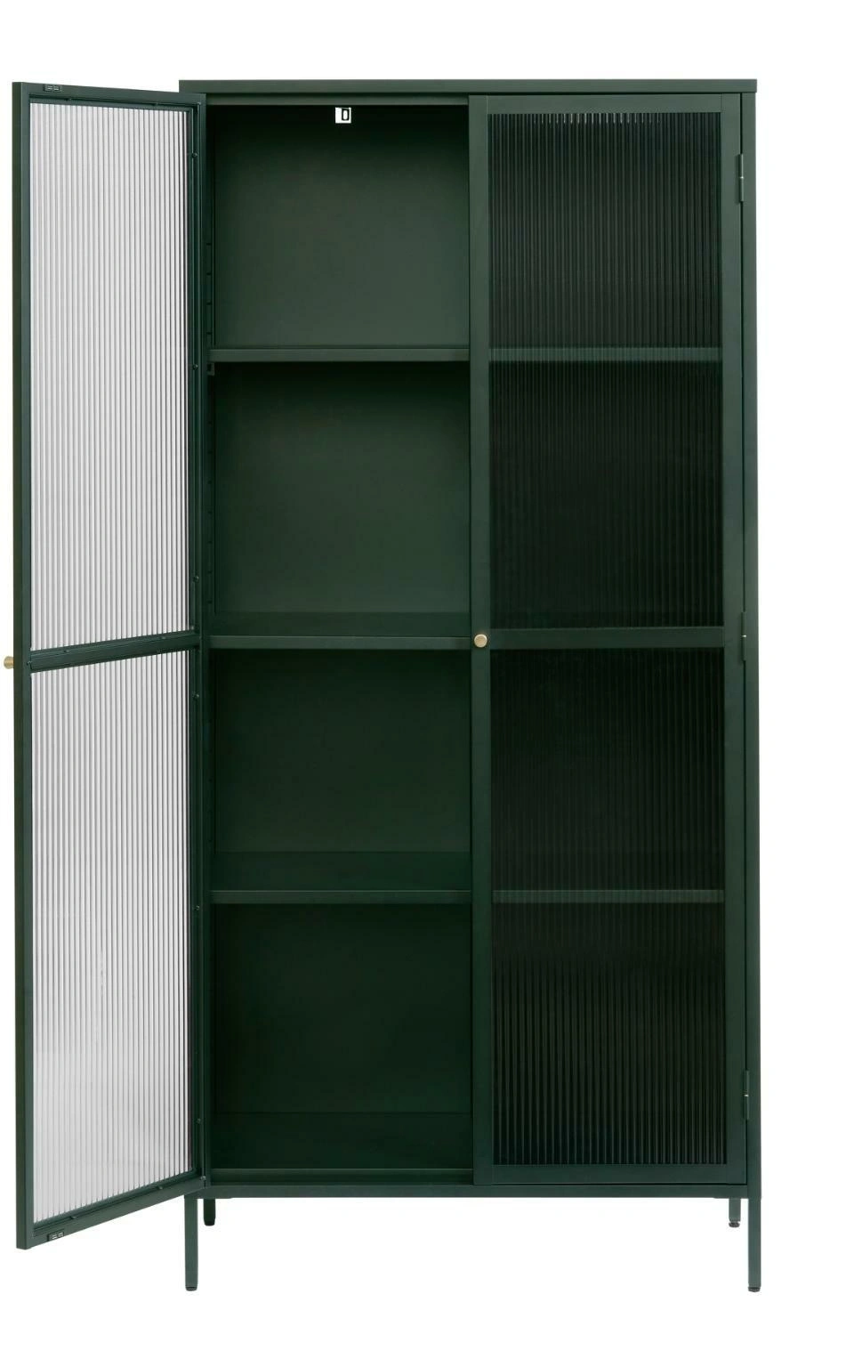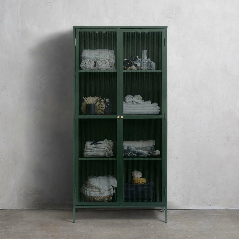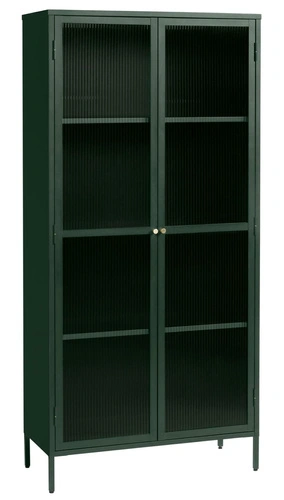 Vitrína Bronco 190 cm od značky UNIQUE je vysoký kovový regál s rýhovaným sklem, ideální jako moderní skleněná vitrína do obývacího pokoje na alkohol, sklo nebo dekorace. Štíhlá silueta o výšce 190 cm a šířce 90 cm, postavená na jemných nohách, spojuje loftový charakter s elegantním, matným povrchem v hlubokém zeleném odstínu.