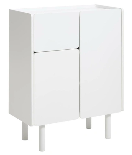 Komoda Bera značky UNIQUE je vysoká, moderní bílá komoda o šířce 80 cm, navržená pro praktické ukládání věcí v obývacím pokoji, ložnici nebo předsíni. Je vyrobená z kvalitní nábytkové desky v bílém lesku, stojí na štíhlých dřevěných nohách a nabízí funkční vnitřní prostor se dvěma skříňkami a policí, při zachování lehké, elegantní formy.
