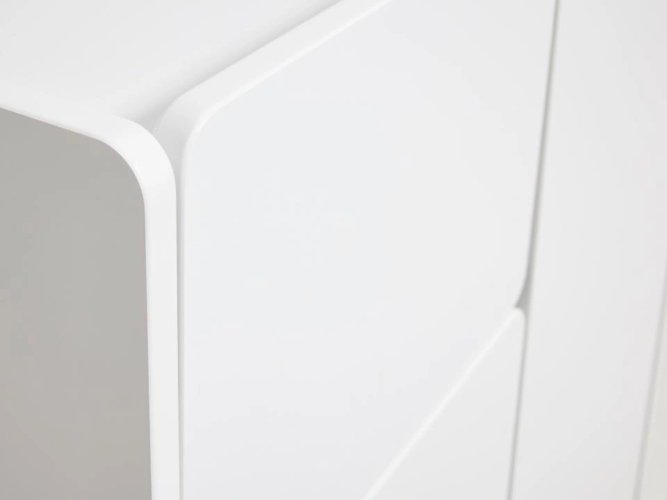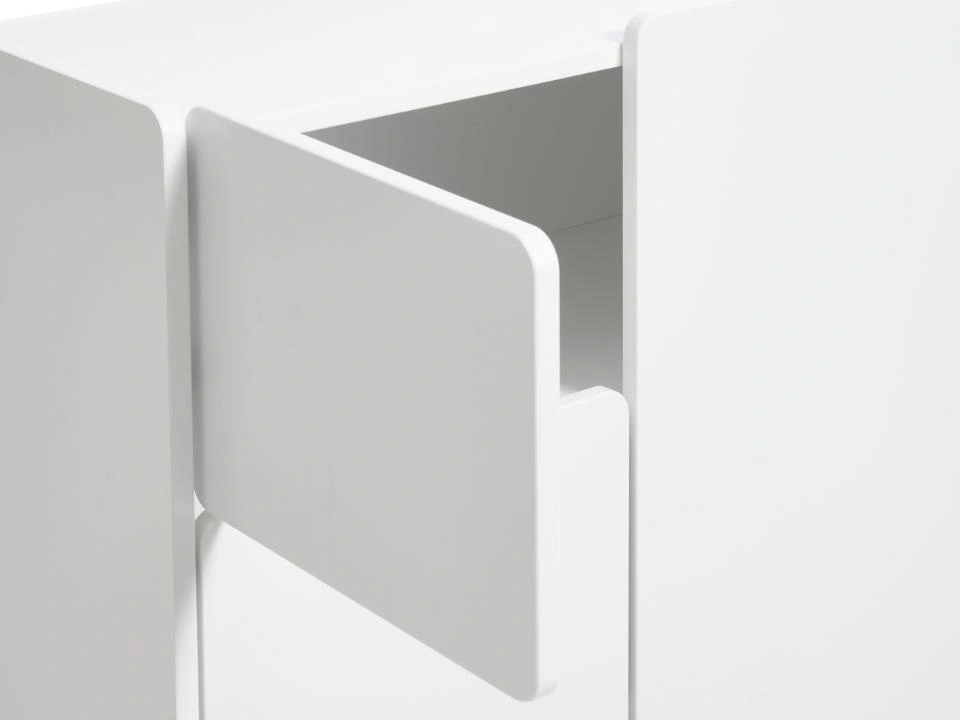 Bílá komoda Bera spojuje jednoduchost moderního designu s měkkými, zaoblenými liniemi typickými pro styl japandi. Hladké čelní plochy bez zbytečných ozdob vytvářejí klidnou, harmonickou plochu, která interiér nezatěžuje, ale naopak ho přehledně uspořádá. Bílý lesk krásně odráží světlo, prosvětluje místnost a opticky ji zvětšuje – ocení to zejména majitelé menších obývacích pokojů a ložnic.