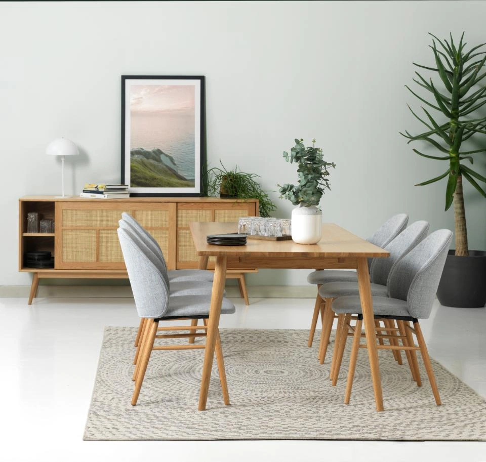 Jde o kus nábytku, který skvěle vynikne jak ve světlé jídelně s dřevěnou podlahou, tak v moderním obýváku propojeném s kuchyňským koutem. Neutrální, přírodní barvu dřeva snadno zkombinujete s bílými, šedými i černými židlemi a vytvoříte tak jednotný, nadčasový prostor.