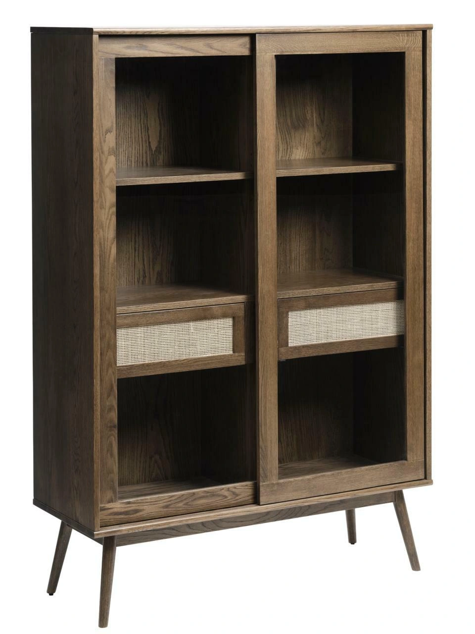 Vitrína Barrali je řešení pro ty, kteří hledají jeden kus nábytku kombinující dekorativní skleněnou vitrínu s praktickou skříňkou pro každodenní použití. Její skandinávský charakter, kouřový dub a jemné ratanové detaily zajistí, že harmonicky zapadne jak do moderních, tak do útulných, přírodně laděných interiérů.