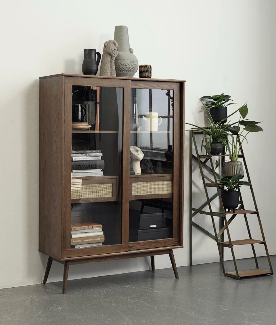 Vitrína Barrali značky UNIQUE Furniture A/S je elegantní dřevěná vitrína o výšce 160 cm, která krásně vystaví knihy i alkohol a zároveň pomůže zorganizovat drobnosti v obývacím pokoji. Kombinuje dýhovaný kouřový dub, sklo a přírodní ratan, díky čemuž vzniká funkční dekorativní nábytek s výrazným skandinávským charakterem.