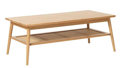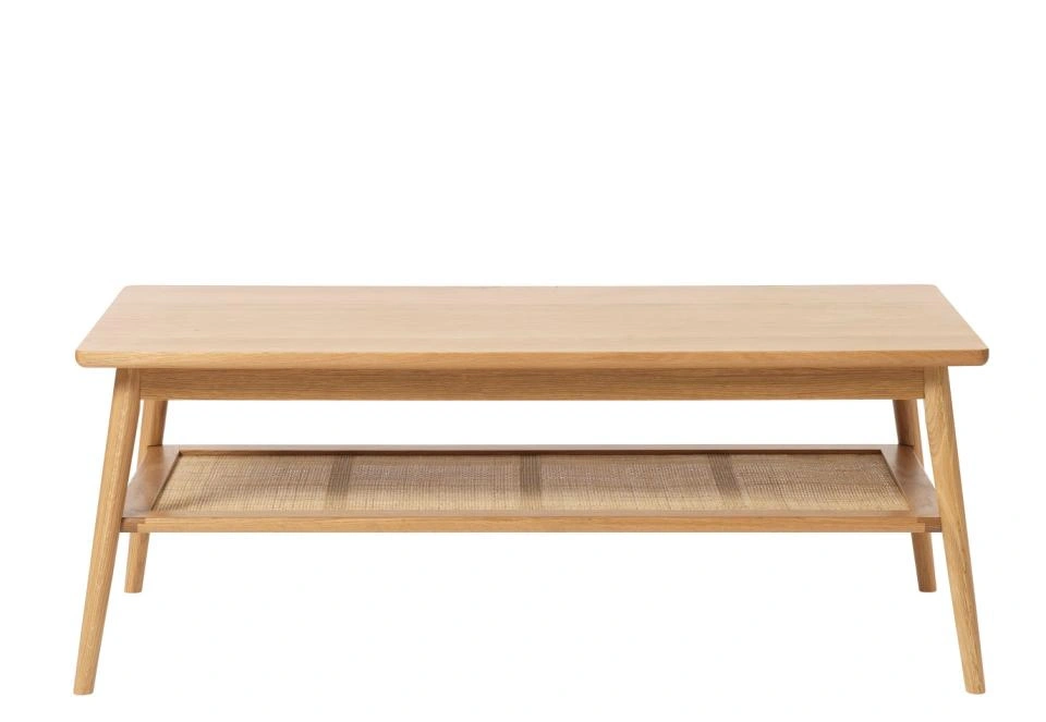 Deska kávového stolku je vyrobena z desky upravené dubovou dýhou, takže nabízí vzhled dubového dřevěného konferenčního stolku při zachování atraktivní ceny a stability. Pod deskou se nachází dekorativní police z přírodního ratanu – ideální místo na časopisy, ovladače nebo dekorační krabice, které chcete mít po ruce, ale ne přímo na očích. Díky této konstrukci plní Barrali funkci jak kávového stolku, tak praktického odkládacího stolku.