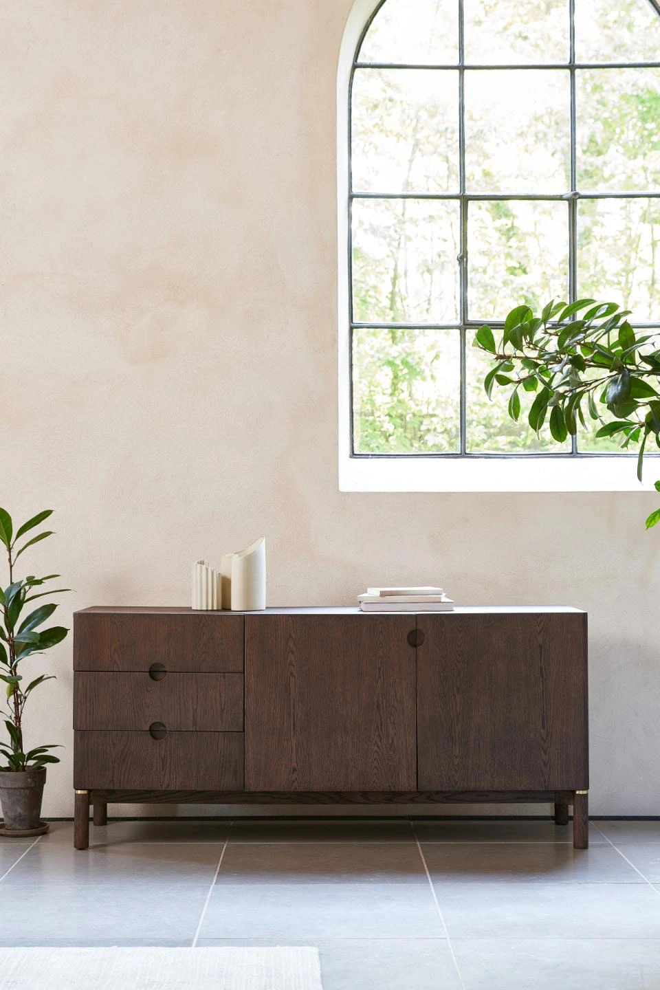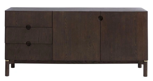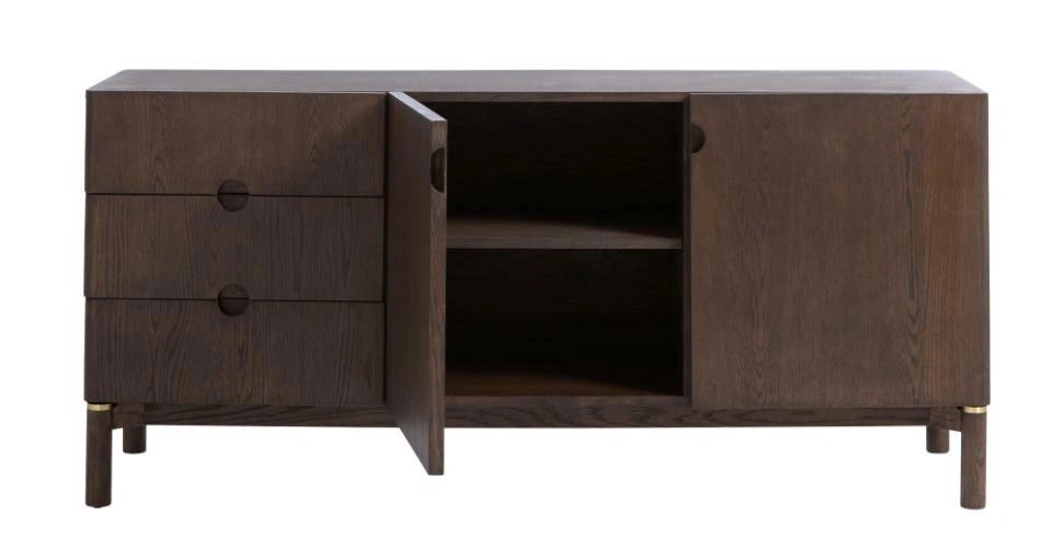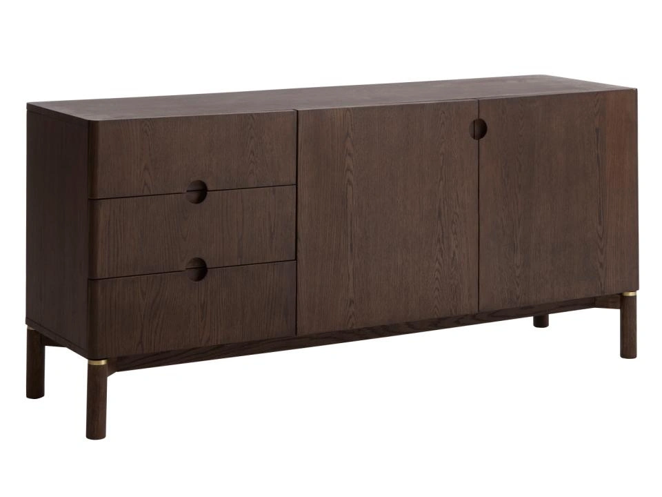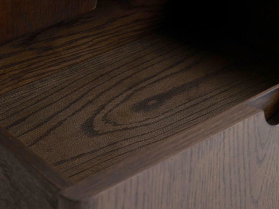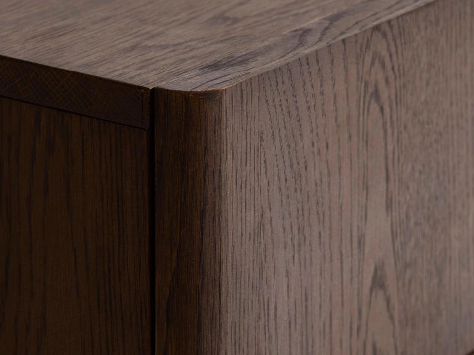Korpus komody je pokrytý přírodní dubovou dýhou v tmavém odstínu espresso a celý povrch je ošetřený olejováním. Díky tomu je struktura dřeva dobře viditelná a příjemná na dotek a komoda působí jako masivní dřevěný kus nábytku. Stabilní nohy z dubového dřeva odlehčují konstrukci a dělají z modelu praktickou komodu na nožičkách – pod komodou snadno vysajete nebo vytřete a udržíte doma čistotu.