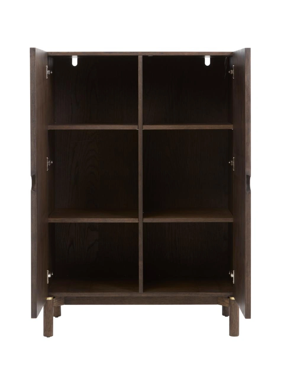 Při výšce 130 cm a šířce 90 cm nabízí tato vysoká komoda se dvěma skříňkami a čtyřmi policemi dostatek úložného prostoru, aniž by zabrala mnoho místa na podlaze. Je to ideální volba do obývacího pokoje, pokud potřebujete místo na nádobí, textilie nebo dokumenty, ale nechcete interiér zaplnit rozměrným nábytkem. Obdélníková horní deska komody se skvěle hodí také jako nenápadná plocha na dekorace – stolní lampu, rámečky s fotografiemi nebo vázu s květinami.