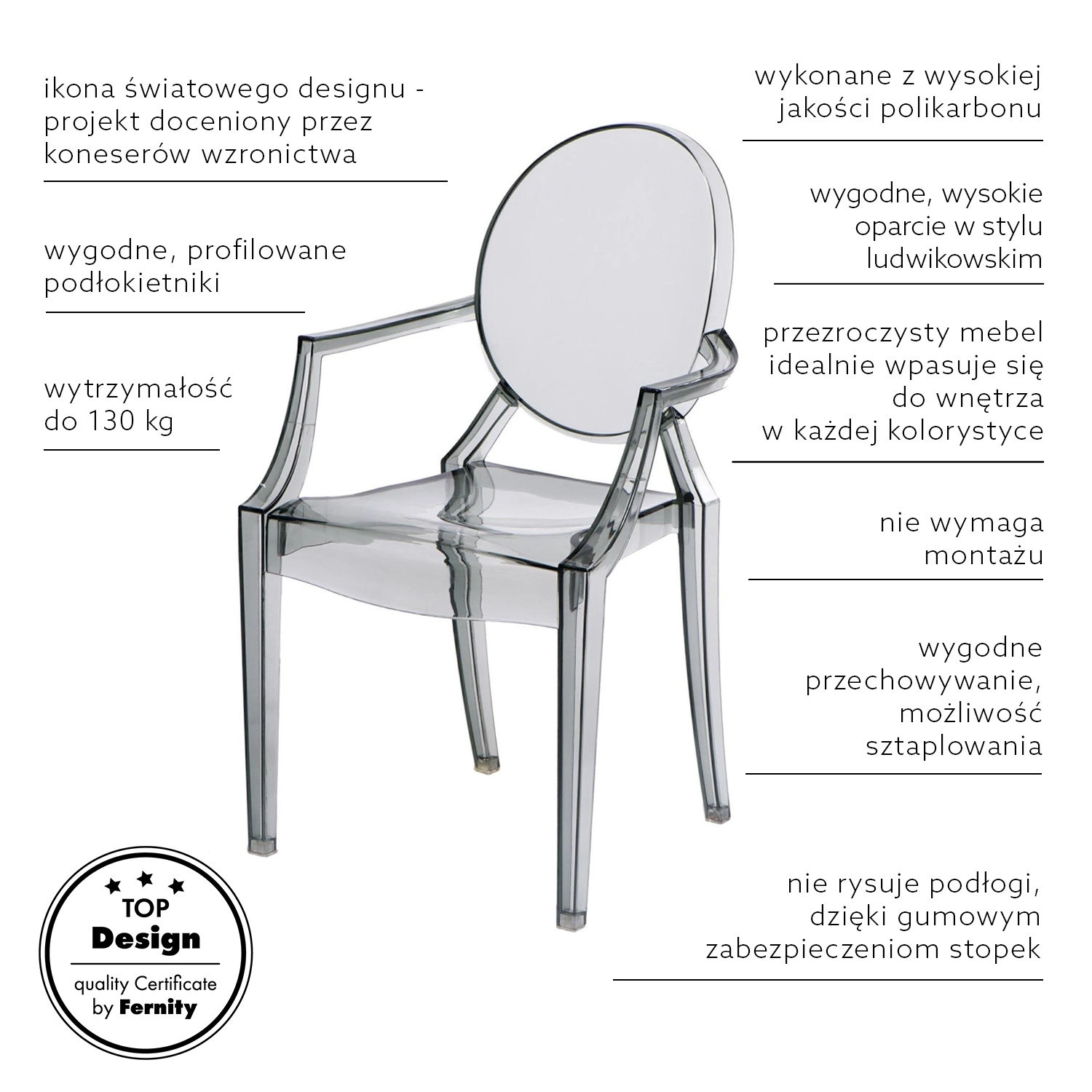 Royal Ghost je vyrobena z odolného polykarbonátu, díky čemuž je odolná vůči povětrnostním vlivům a snadno se udržuje v čistotě – pro osvěžení vzhledu stačí vlhký hadřík. Možnost stohování umožňuje pohodlně uložit několik kusů, když je právě nepotřebujete, což je praktické jak do domácnosti, tak do zahrady nebo veřejných prostor či stylových banketních sálů. Židle je připravena k použití ihned po vybalení – bez potřeby montáže.