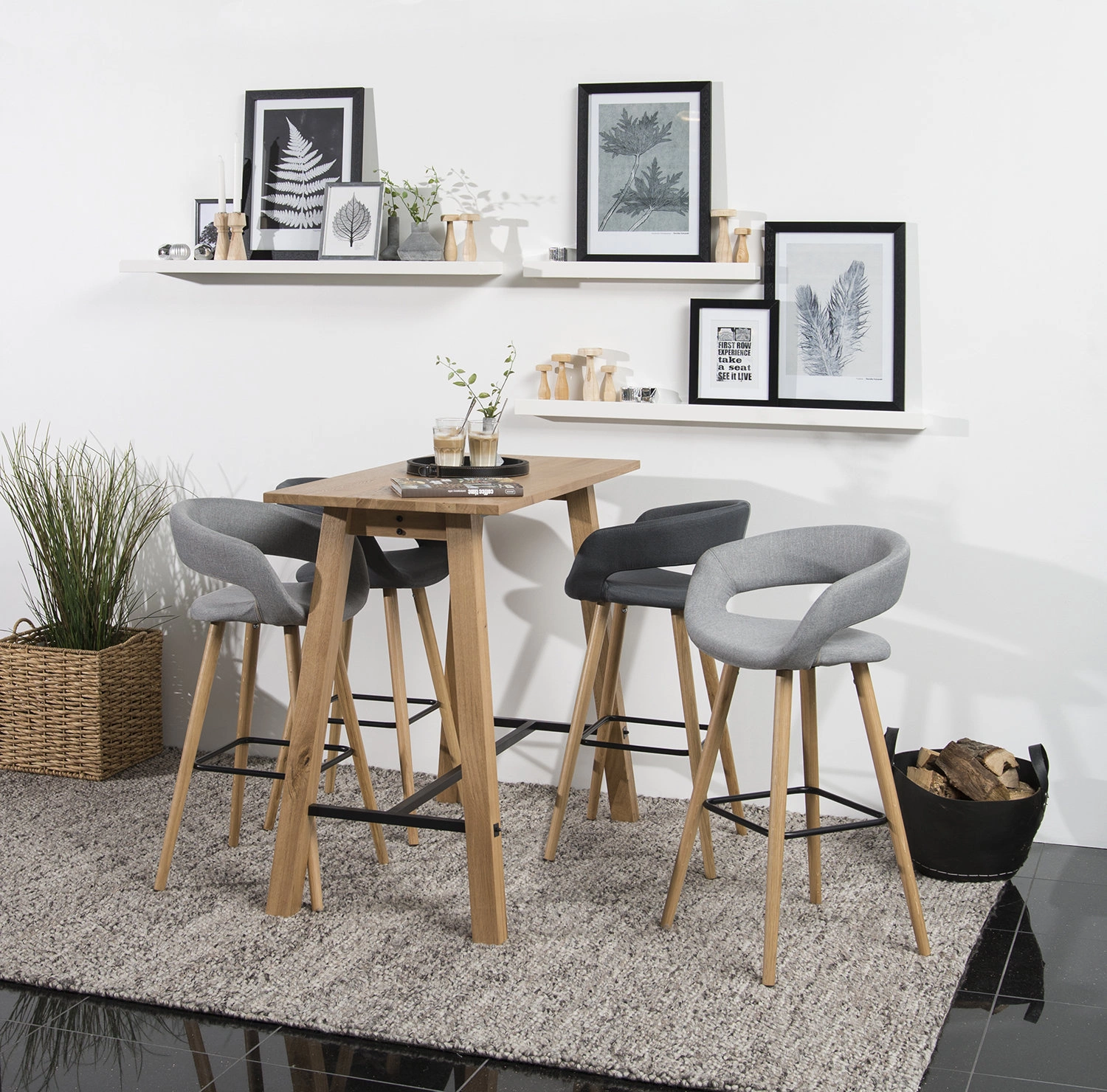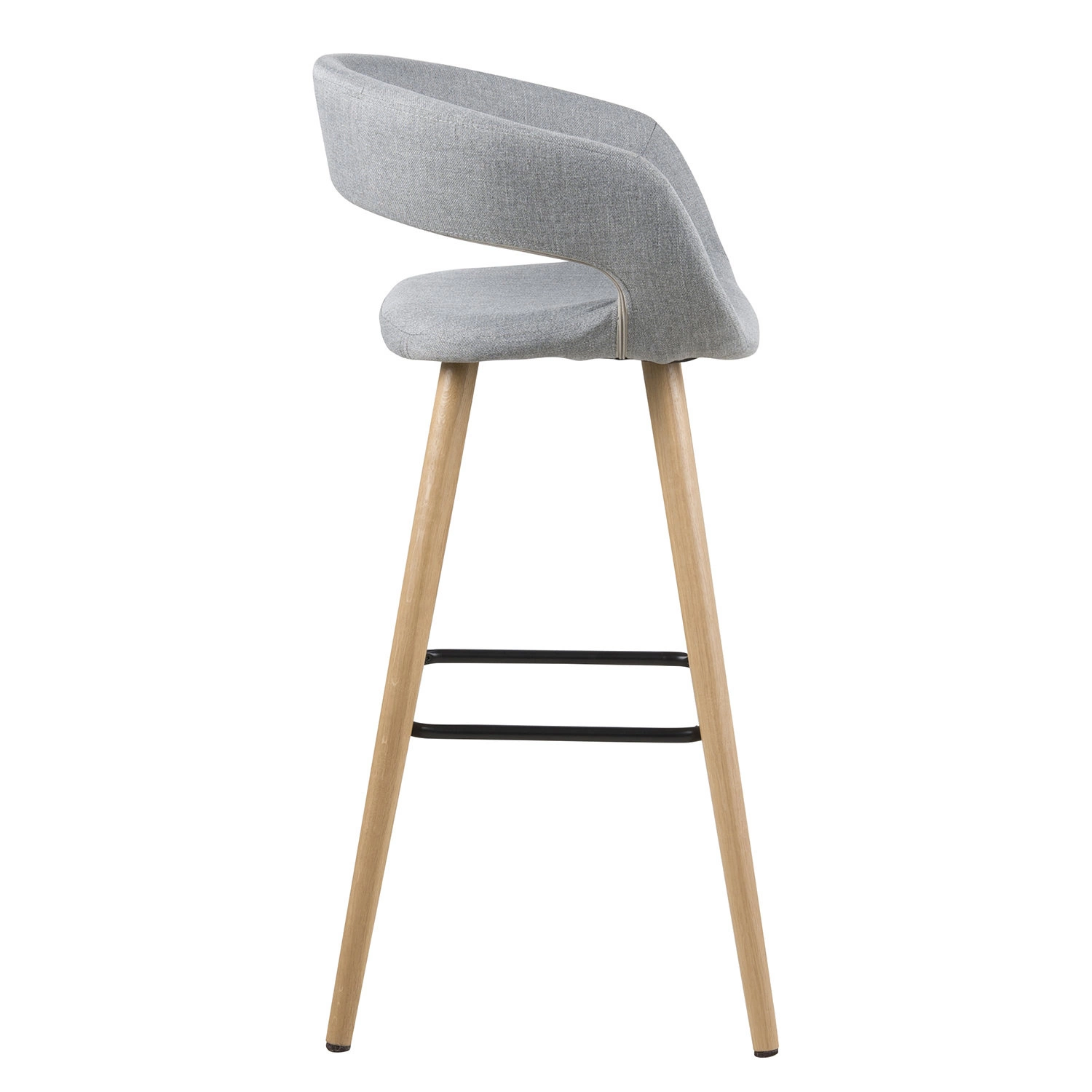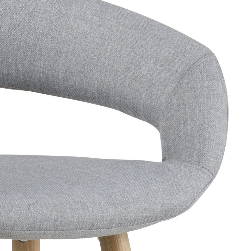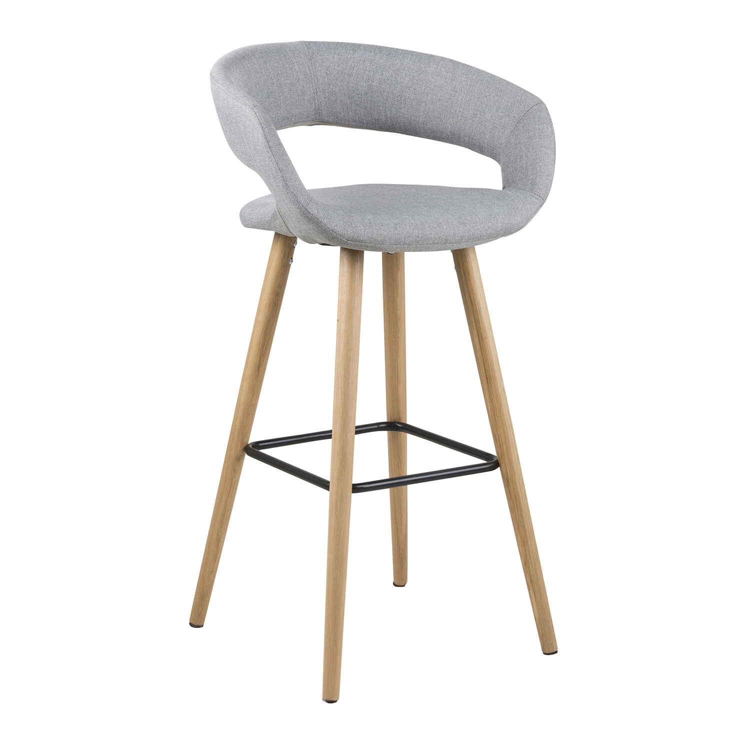 Barová stolička Grace se vyznačuje jedinečnou konstrukcí. Sedák s neobvyklým tvarem je vyrobeny ze světle šedého materiálu, zatímco základem jsou olejované nohy z masivního dubu. Stolička Grace je velmi pohodlná.