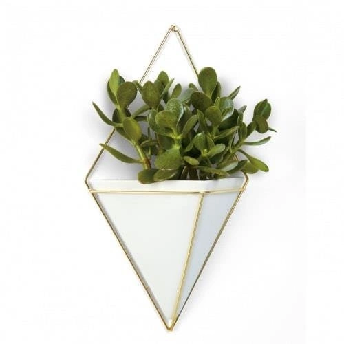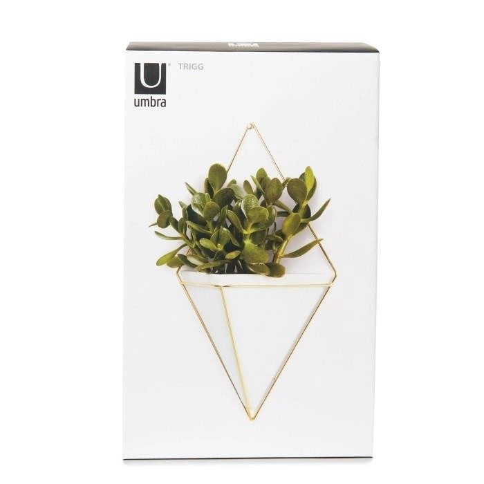 Nástěnný květináč Trigg od značky Umbra je jedinečný, geometrický závěsný keramický květináč, který okouzlí kombinací bílé a zlaté barvy a zároveň vysokou funkčností. Jeho tvar inspirovaný moderními liniemi z něj dělá nejen květináč na bylinky, ale také stylovou nástěnnou dekoraci do kuchyně, obývacího pokoje nebo kanceláře. Sada obsahuje keramický květináč o rozměrech 39 cm na výšku, 23 cm na šířku a 9 cm do hloubky, zavěšený v elegantním zlatém rámu.