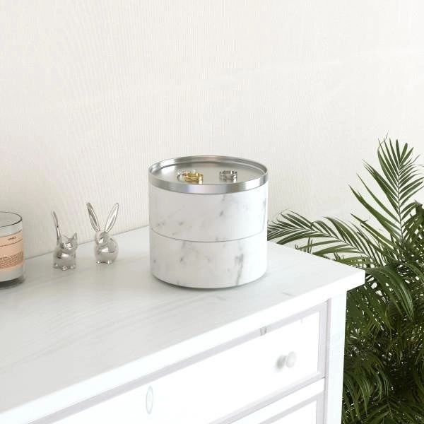 Výrazný, moderní organizer na šperky kombinuje lesklé chromované víko s matnou bílou pryskyřicí a stává se tak stylovou ozdobou každé toaletky, komody nebo zásuvky. Kompaktní tvar (13×13×11 cm) šetří místo, ale zároveň nabízí dostatek prostoru pro uložení šperků. Umbra Tesora je nejen praktický organizer do zásuvky na šperky, ale také krásný detail, který podtrhne charakter vašeho domova.