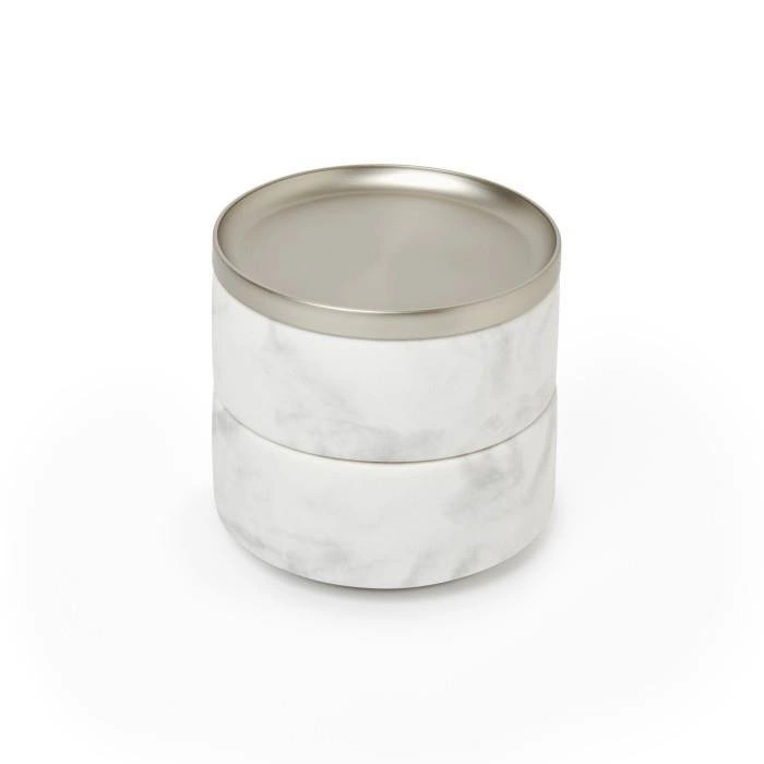 Organizer na šperky do zásuvky Umbra Tesora chromově-bílý je moderní, dvoupatrový box o rozměrech 13×13 cm, vyrobený z odolné pryskyřice a kovu. Jeho designová forma a harmonická kombinace chromu s bílou zvýrazní eleganci každého interiéru. Díky promyšlené konstrukci je ideální jako organizer do zásuvky na šperky – pohodlně do něj uložíte náušnice, prsteny i náramky, aniž by hrozilo jejich zamotání nebo poškrábání.