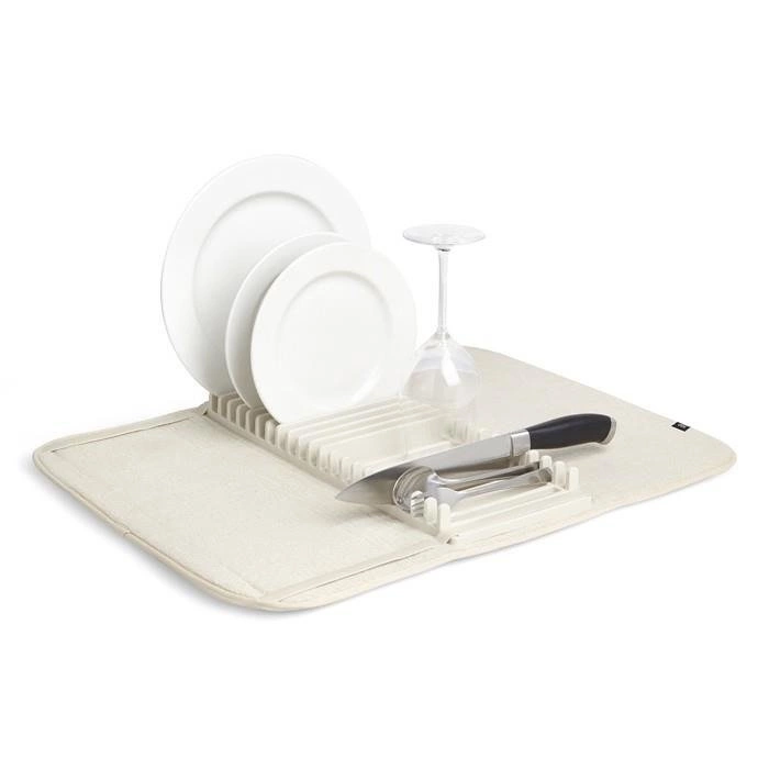 Umbra Udry béžová mikrovláknová podložka na sušení nádobí 60x46 cm je praktický kuchyňský doplněk, který spojuje savou podložku s funkčním odkapávačem. Vyrobena z kvalitního mikrovlákna a plastu, zajišťuje rychlé a hygienické sušení nádobí bez rizika promočení pracovní desky. Velká plocha 60x46 cm umožňuje pohodlné sušení talířů, sklenic i hrnců a zároveň zachovává estetický vzhled vaší kuchyně.
