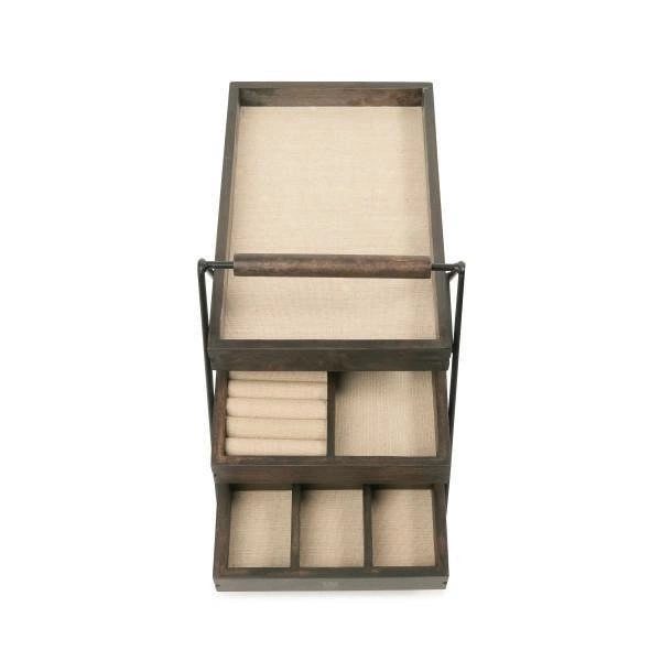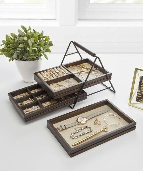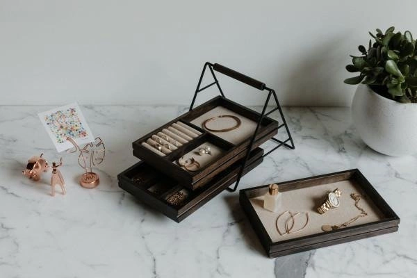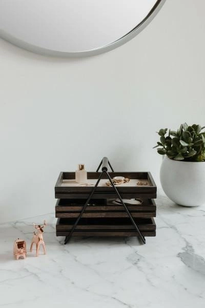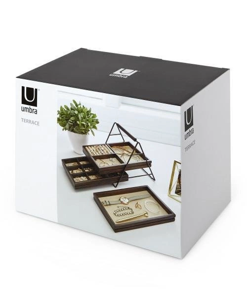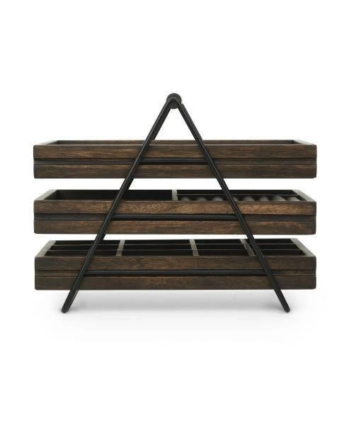 Organizátor Terrace je vyroben z pryžového dřeva, kovu a měkké houby pro šperky pokryté velurem, který zabraňuje poškrábání šperků a hodinek. Každá police má jiné uspořádání, takže najdete místo věnované prstenům, hodinkám, náramkům nebo náušnicím. Další výhodou je možnost vyjmování polic, což usnadňují boční drážky v dřevě.