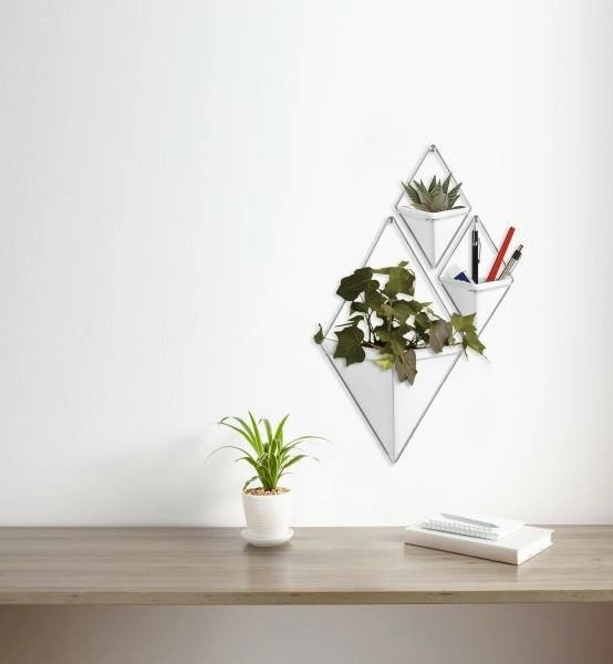 Květináč Umbra Trigg je dokonalým řešením pro lidi, kteří hledají alternativu ke klasickým květináčům. Niklovaný rám dokonale harmonizuje s keramickým květináčem v geometrickém stylu. Návrhářka Moe Takemura vytváří jedinečné věci, které kombinují švédskou jednoduchost s japonským elegantním minimalismem.