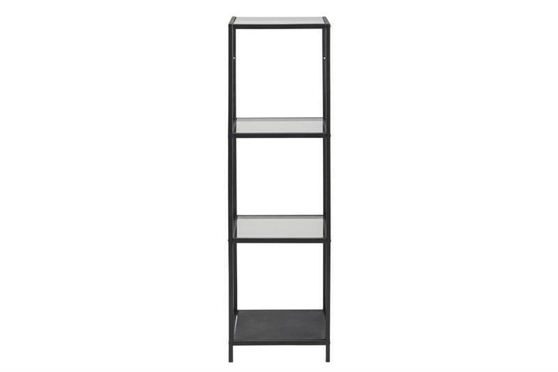 Knihovna Seaford VI je vyrobena z práškově lakovaného kovu a MDF desky s povrchovou úpravou z černého jasanového lamina. Knihovna má 3 skleněné police. Vyžaduje montáž.