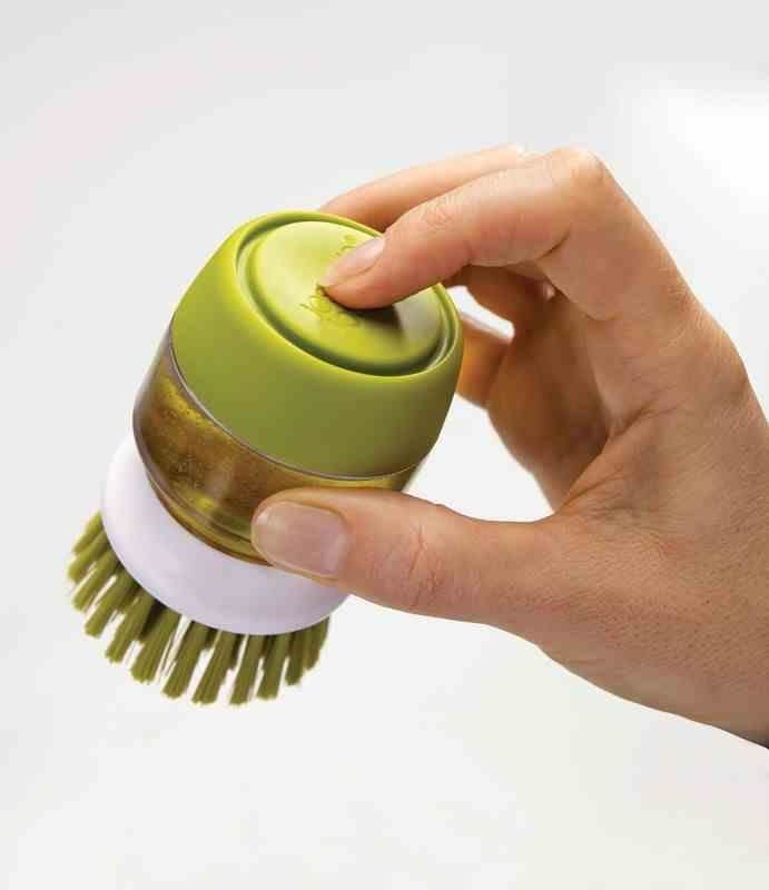 Kartáč na mytí nádobí s pumpičkou, šedý. Inovativní kartáč na mytí nádobí se stojanem. Na mytí hrnců, pánví a nádobí. Skládá se z nádoby na mycí prostředek, kartáče a stojanu s odtokem. Jednoduše odšroubujte nádobu, nalijte mycí prostředek, našroubujte, stiskněte horní tlačítko a umyjte nádobí. Průhledné stěny umožňují kontrolovat množství tekutiny. Ukládání kartáče štětinami dolů je hygieničtější - voda stéká na stojan, nenamáčí desky a kartáč rychleji schne. Celou jednotku lze pro mytí rozebrat - umyjte ji ručně. k dispozici také jako zásoba kartáčků - č. položky 85039.